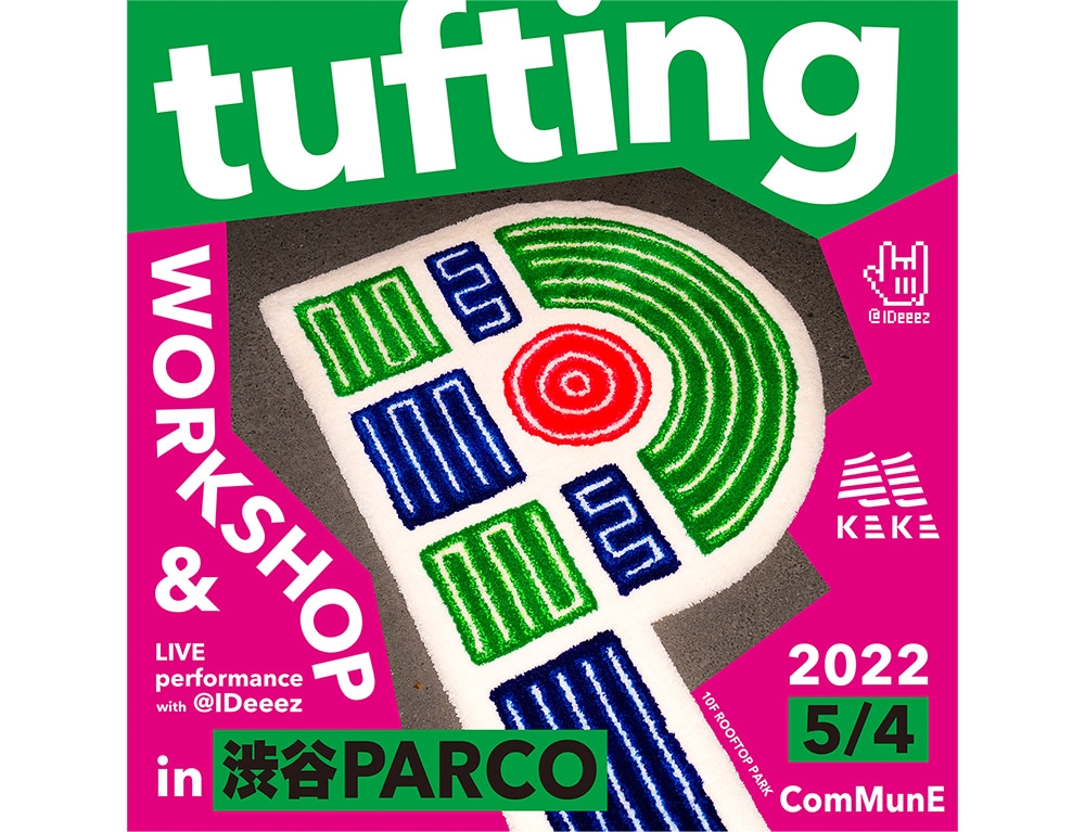 tufting studio KEKEによる出張ワークショップイベントを開催。IDeeez(@ideeez55)のイラストラグをMIYOSHI RUG(@miyoshirug) の職人がその場で制作するライブタフティングパフォーマンスの他、はじめてタフティングに挑戦したい方へ向けたKEKEオリジナル・スターターセットや糸の色見本を実際に見てご注文いただける展示販売も実施いたします。