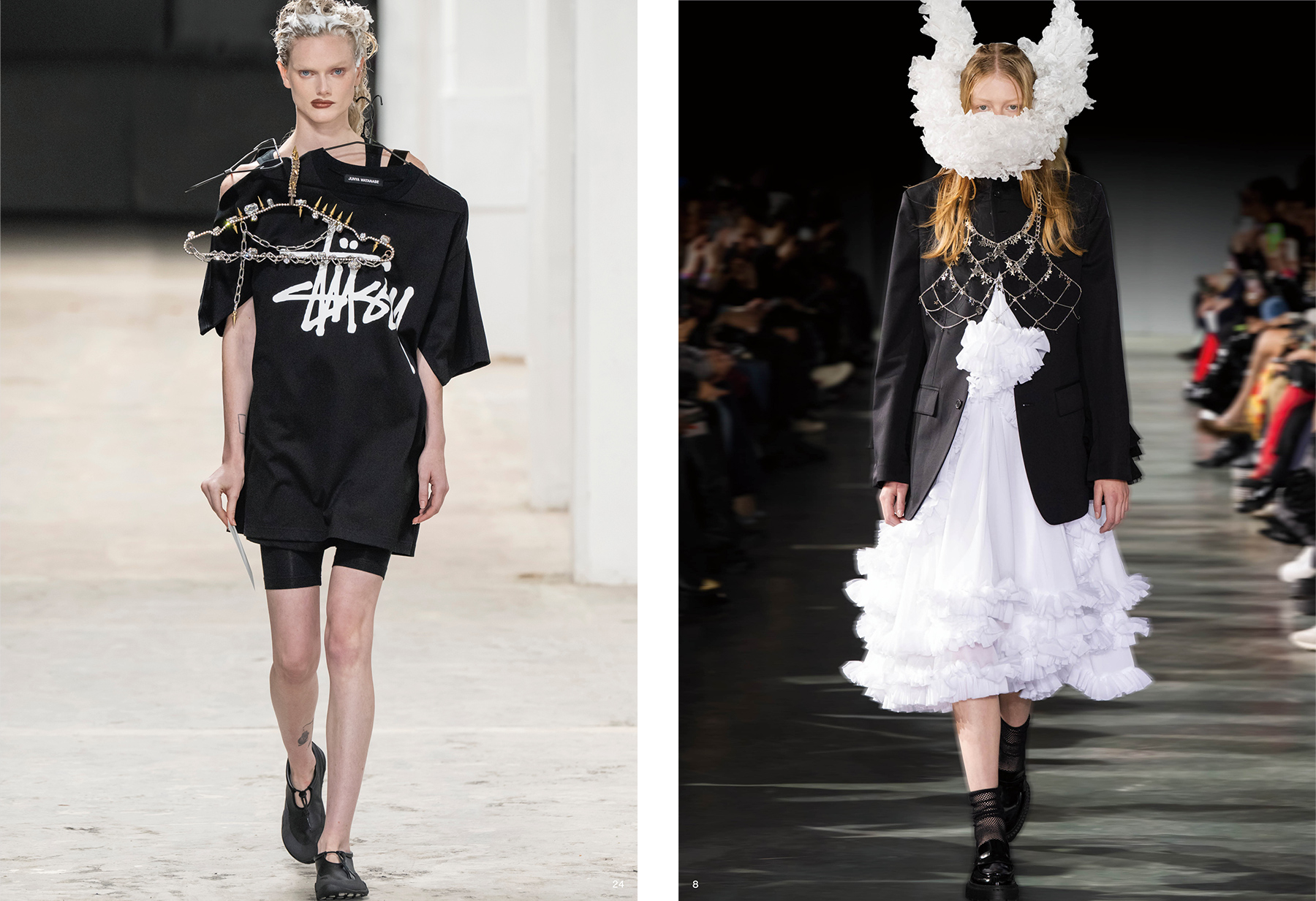 「COMME des GARÇONS」の26SSコレクションは、自由や思いやりが失われつつある世界で、“何か強いことをしなくてはならない”という川久保玲の思いから生まれた。完成された服にあえてダメージを与えることで新しい価値観やポジティブな気持ちが生まれることを信じ、製品後加工を施したピースを製作。これまでにない麻素材を使用したラインナップは、新しさを求めるブランドの姿勢を象徴する。「noir kei ninomiya」では、希望や喜びのシンボルであるスターが主役。「JIMMY CHOO」との協業によるハーネスや革靴、バッグにも注目したい。「JUNYA WATANABE」は、“日常から生まれる非日常のアート”を掲げ、既製品をひとつの素材として捉え、本来の用途とは異なるアプローチでフォルムを探求している。