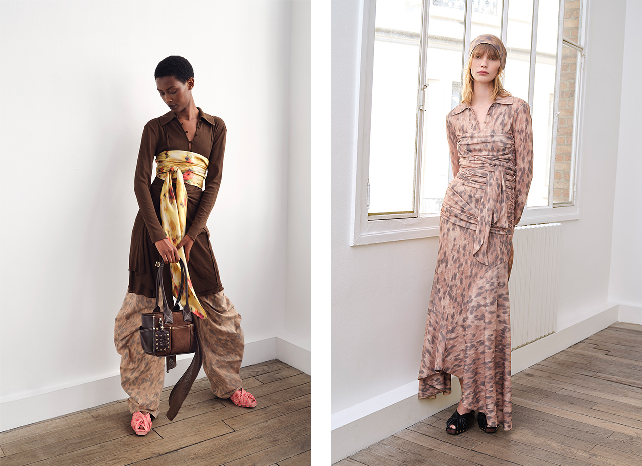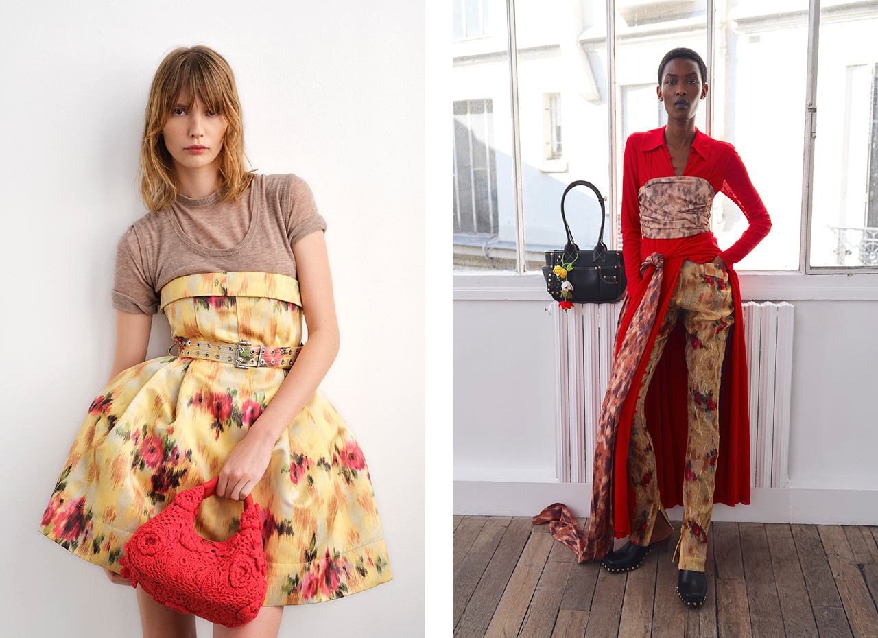 「Summer Belongs To Everyone」をテーマに、クリエイティブ・ディレクターがデンマークの漁港の町で過ごした幼い夏の記憶を映し出す。今季はパッチワークスタイルを主役に、鮮やかなレッド×フューシャピンク、ターコイズ×フローラル、イエローからグレーへ移ろうブラウンなど、大胆で実験的な色彩が躍る。ハンドクロシェや縫い付けのディテールが立体的なフォルムを生み出し、ドレーピングやラッピングはドレスやシャツに流れるような表情を添える。長いスカーフをバンドゥやベルト、ドレープとして結び直すスタイリングが印象的。ガーデナーから着想を得た、大きなポケット付きの新作バッグ「Posy Bag」にも注目したい。