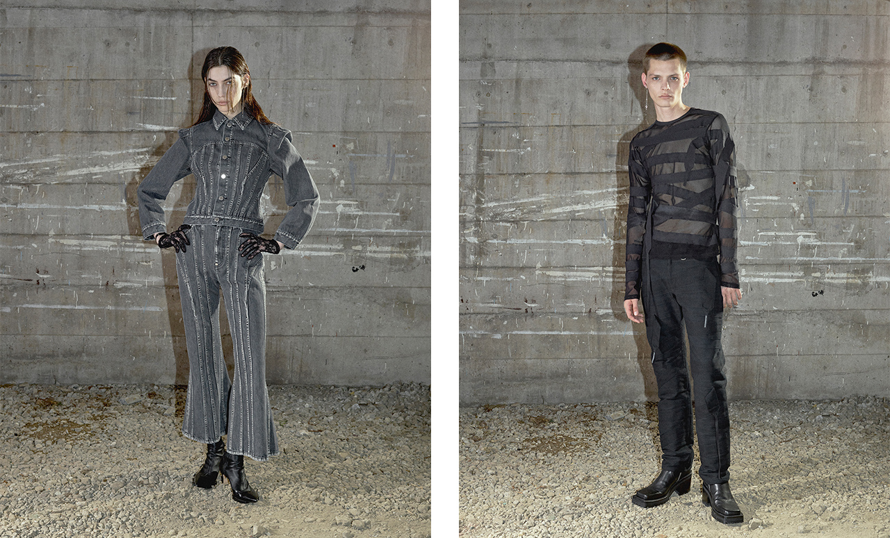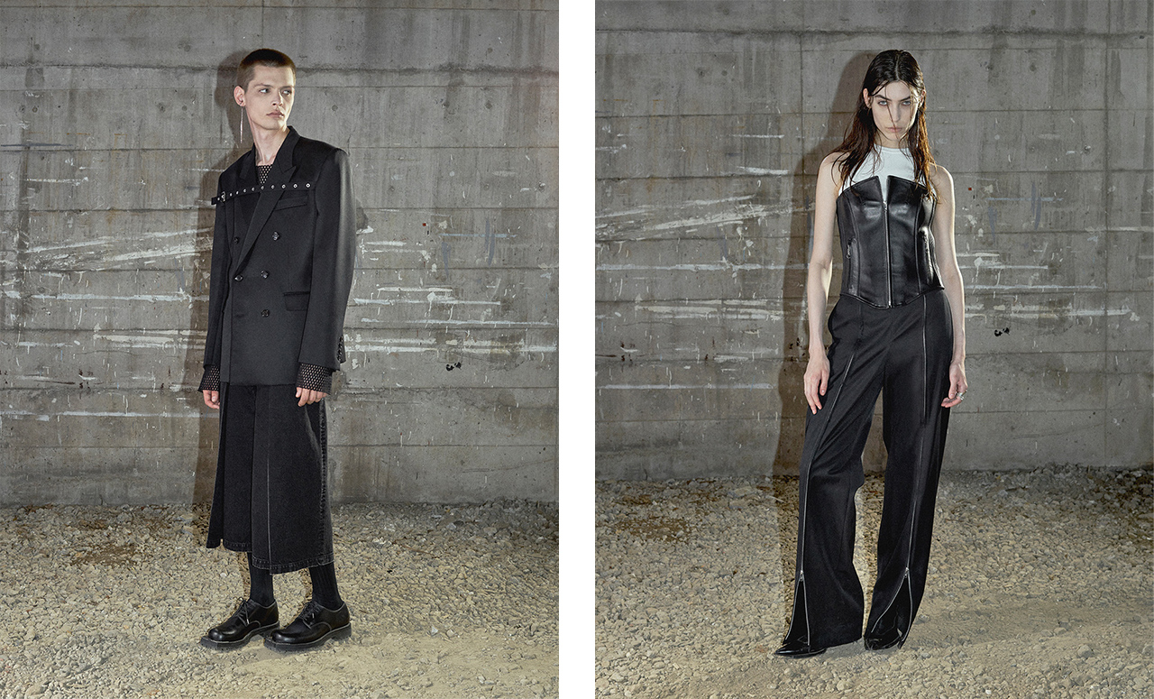 20世紀後半に活躍した写真家ロバート・メイプルソープの世界観を起点にした26SSコレクション。なかでも彼⾃⾝がナイフを⼿にし被写体となった代表作『Self Portrait』に着想を得て、ナイフモチーフを採用し、攻撃的で反抗的なアティチュードを裁ち切り仕様で表現。一方、傷を治癒するかのように包帯を巻き付けたようなデザインも登場。ウィメンズでは、作品に登場する⼥性像に着目し、コルセットやビスチェのシェイプを⼤胆なギャザリングやタックダーツ、パワーショルダーへと昇華。ボクサーのキャリアを持つデザイナーのパーソナルな視点を重ね、官能性や苦痛、普遍性、抑圧といった感情を映し出した。