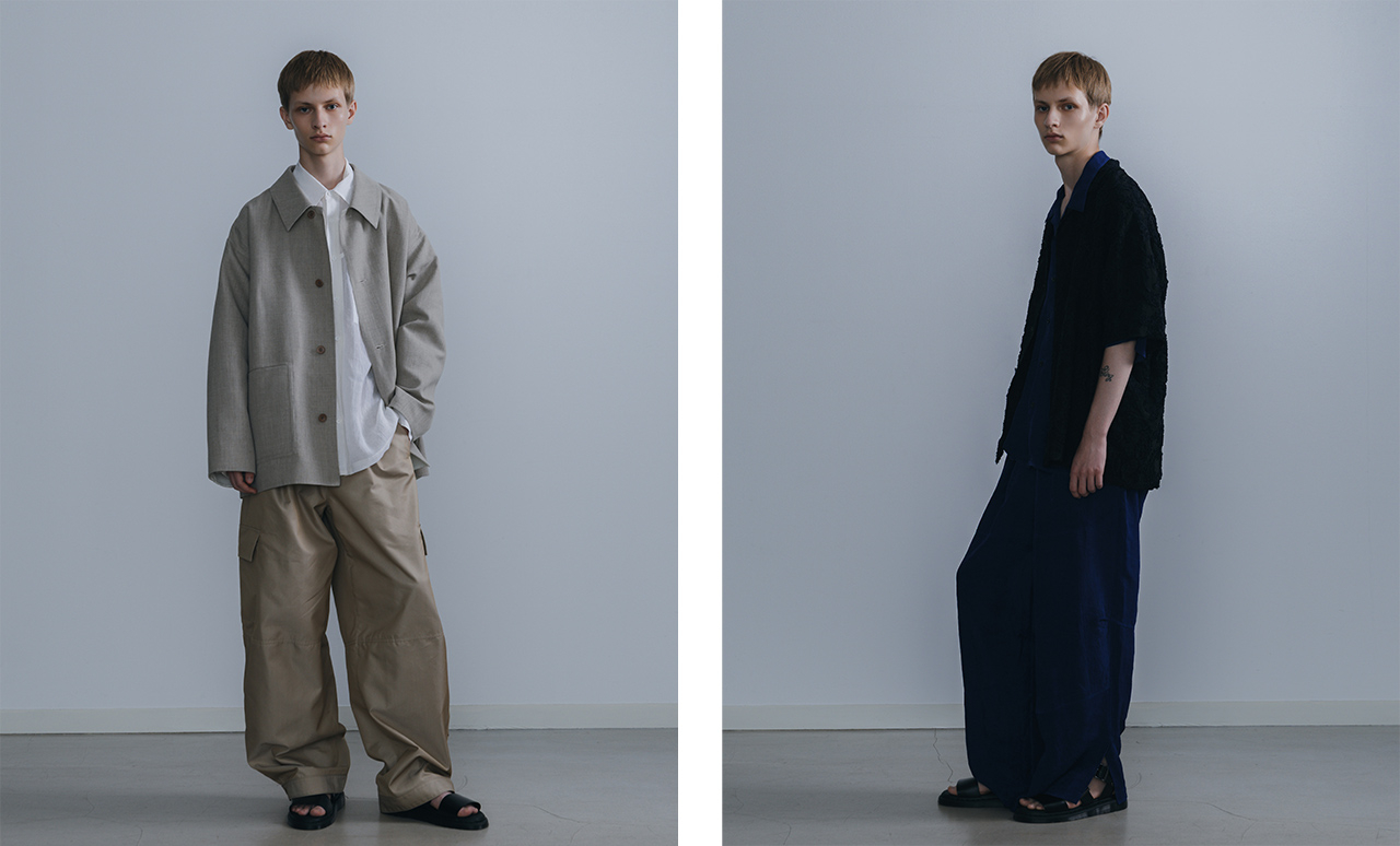前シーズンに引き続き、メンズとウィメンズの境界を曖昧にしたニュートラルなルックを展開。透け感や素材のレイヤードによって生まれるニュアンスで、柔らかく芯のある佇まいを表現。ミリタリーやワーク、エレガンスといった異なる要素が静かに溶け合って、タイムレスな魅力を放ちながら、着る人の個性を際立たせる。トレンチコートはミディアム丈で丸みあるシルエットを形成。同素材のパンツはタックパンツとカーゴパンツを融合したシルエットで、裾の釦を止める位置によってバレルパンツのようなカーブを描く。同素材を重ねていくことで、奥行きと余白を感じる新しいバランスに。