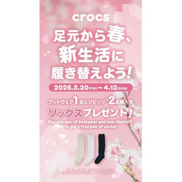 キャンペーン期間中にお好きなシューズとジビッツチャームを2個以上お買い上げでcrocsロゴ入りオリジナルソックスをプレゼントいたします。