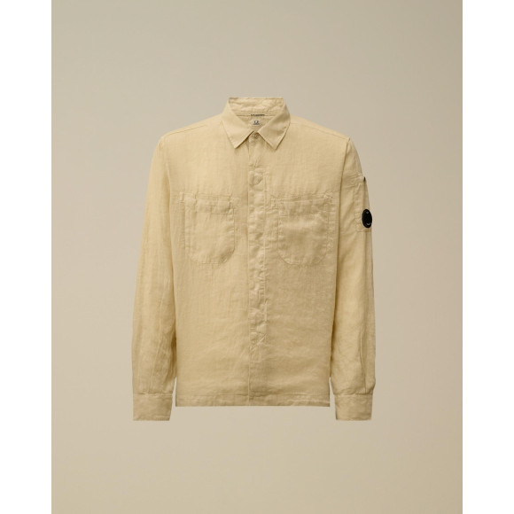 ●軽量で通気性に優れたリネン素材の長袖シャツ。クラシックな襟、隠しボタン留め、胸のオープンポケットが特徴。